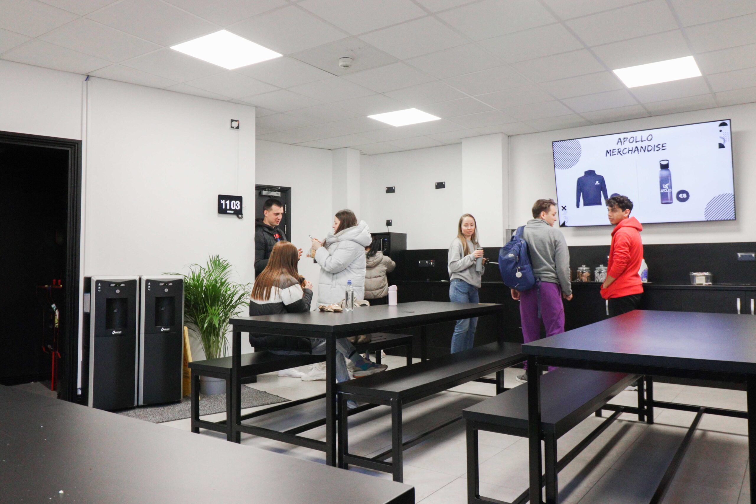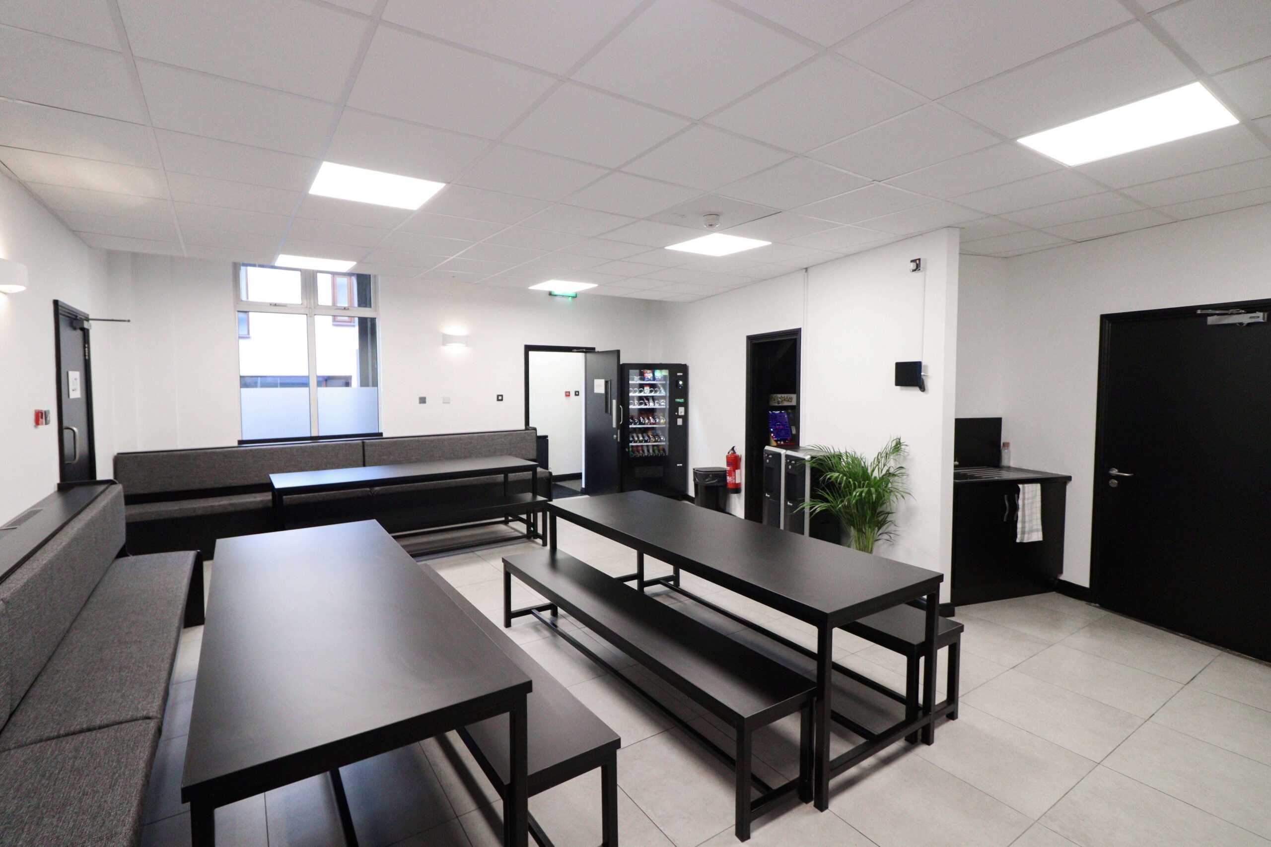 - a modern, spacious cafeteria with an outdoor area and self-service tea and coffee facilities